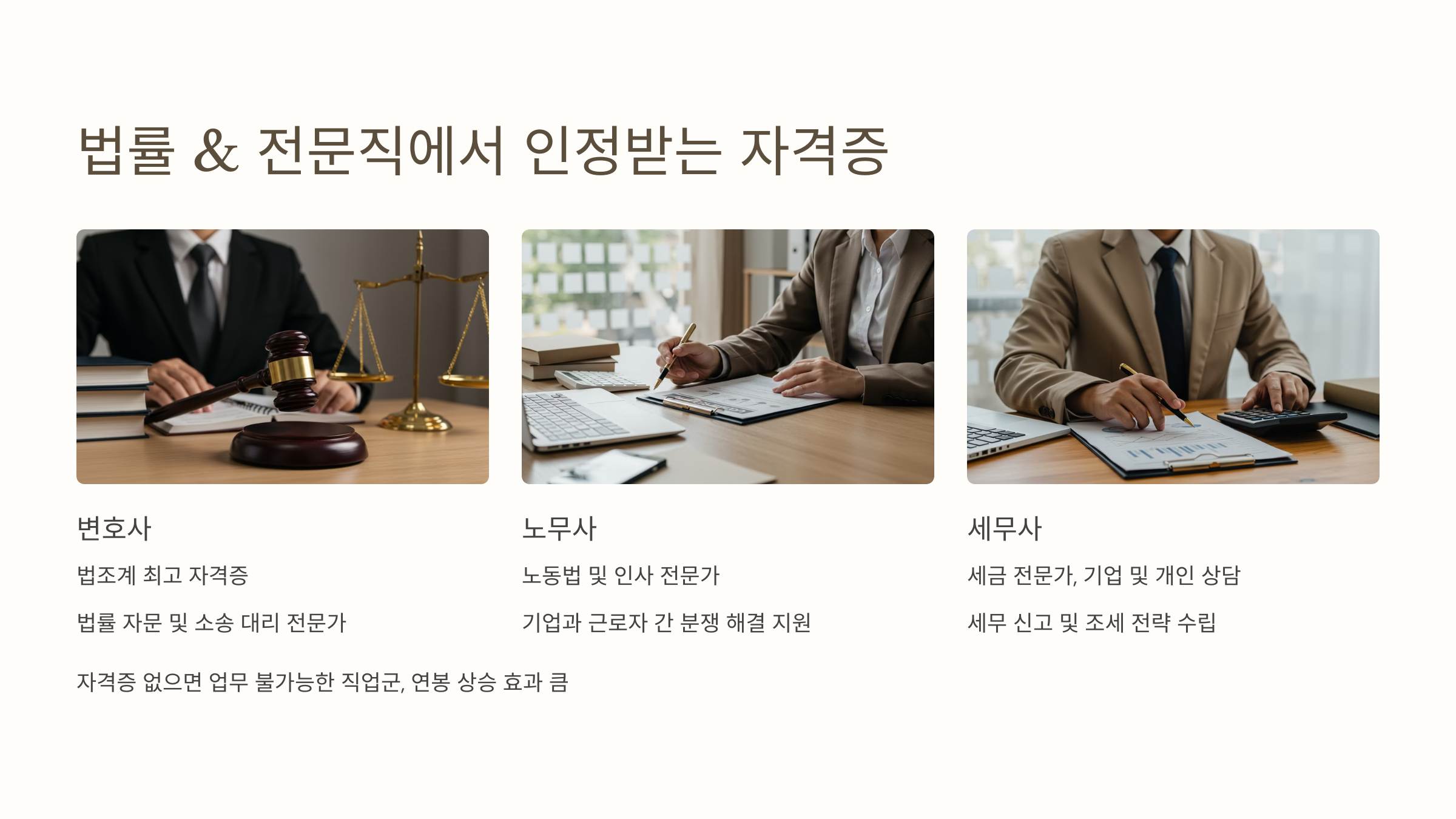 법률 및 세무 분야는 전문성이 요구되며, 자격증이 없으면 아예 업무를 할 수 없는 직업군이